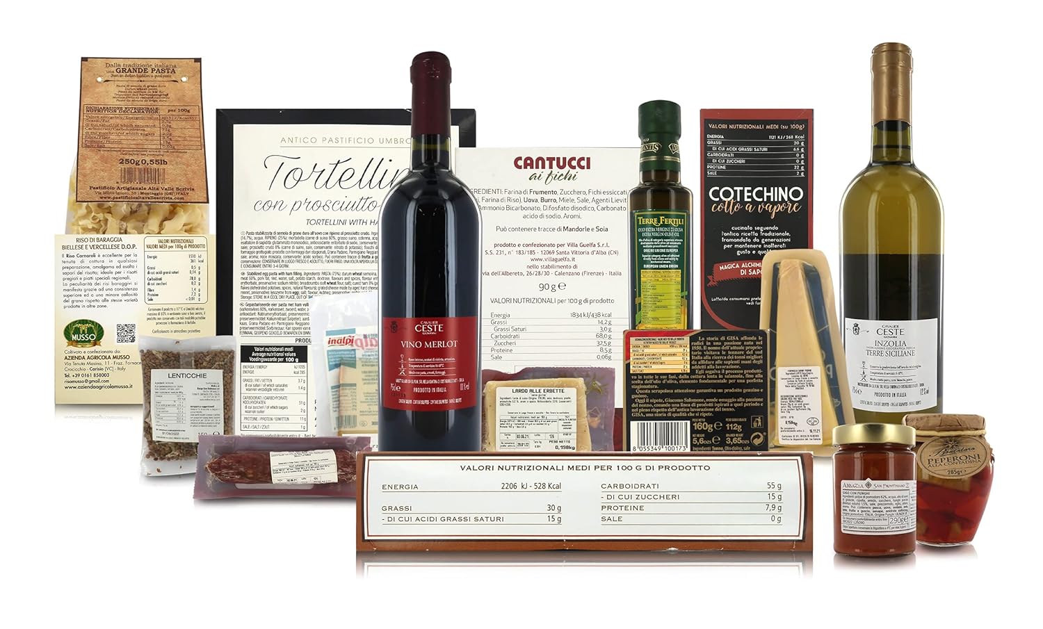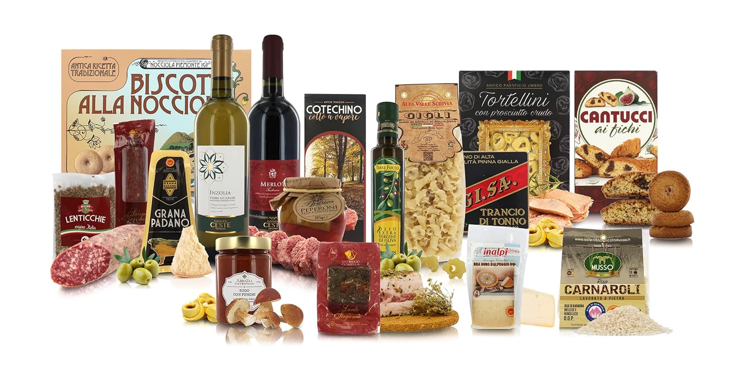 Als zeitlose Geschenkidee zu Weihnachten ist der Korb mit typischen Speisen jedes Jahr ein großer Erfolg bei Freunden, Verwandten und Mitarbeitern in Italien. Dieser besondere Geschenkkorb wird in Italien von der Firma Villa Guelfa hergestellt und enthält folgende Spezialitäten: Eine Flasche Varinera-Rotwein von Cantine Cav. Ceste 750 ml Flasche Varinera Weißwein von Cantine Cav. Ceste, 750 ml Stück gereifter Bra Duro d’Alpeggio DOP (gU) Inalpi, 150 g Stück Grana P. DOP (PU-Käse) Virgilio, 150 g Schmalzscheibe mit Kräutern von Salumificio Gonella, ca. 200 g. Salami aus reinem Schweinefleisch von Salumificio Gonella, ca. 100 g Salumificio Vecchi gedämpfte Cotechino-Wurst, 400 g Rabatin (Mini-Brotstangen) mit Pecorino-Käse und Pfeffer von der Monviso-Gruppe, 50 g Flasche Balsamico-Essig aus Modena IGP (ggA) Mengazzoli, 250 ml Packung Risotto mit Steinpilzen von Bella Italia, 200 g Packung „Gigli“-Nudeln, 100 % italienisches Poggio del Duca Poggio del Duca-Nudeln, 250 g Tomatensauce mit Pilzen von Saporie, 185 g Feigen. Cantucci-Kekse von L’Albereto, 80 g Kekse mit g.g.A. La Sassellese Piemontesische Haselnüsse 90 g Gelbflossen-Thunfischsteak in Olivenöl von Gi.Sa, 160 g Krug mit Bontaloro-Töpfen 285 g Würzige Sardinen in Olivenöl von Angelo Parodi 120 g. Kühl, trocken, geruchlos und vor Licht und Wärmequellen geschützt lagern. Das Verfallsdatum, die Chargennummer und die Herstellerhinweise für jedes Produkt finden Sie auf der Innenseite der Verpackung. Allergene: Gluten, Milch, Eier, Sulfite, Nüsse, Soja, Sesam, Senf, Lupinen, Sellerie, Weichtiere, Fisch. Die Stärke der Körbe der Villa Guelfa liegt in der Aufmerksamkeit und Freude bei der Auswahl besonderer Speisen und Weine.