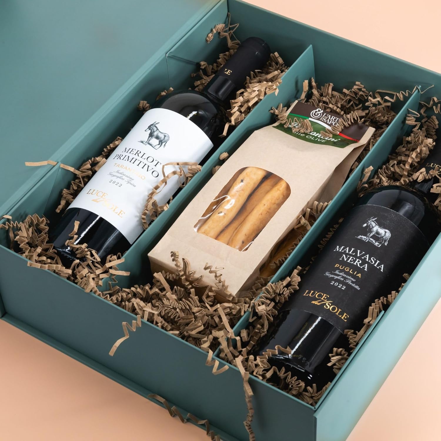 Wein-Präsentkörbe – Weinbox Italien mit Bio-Grissini – Premium-Geschenkset mit Merlot-Primitivo & Malvasia Nera von Luce del Sole aus Apulien, perfekt für Weinliebhaber und besondere Anlässe